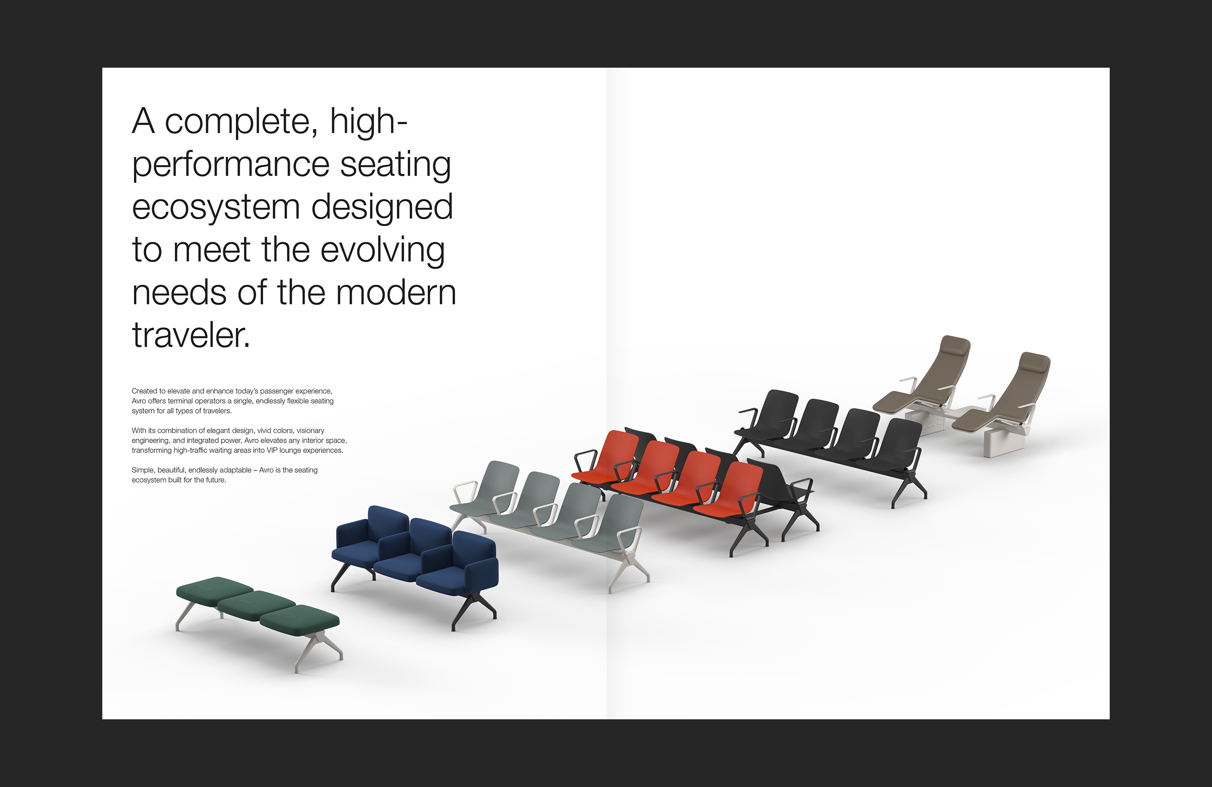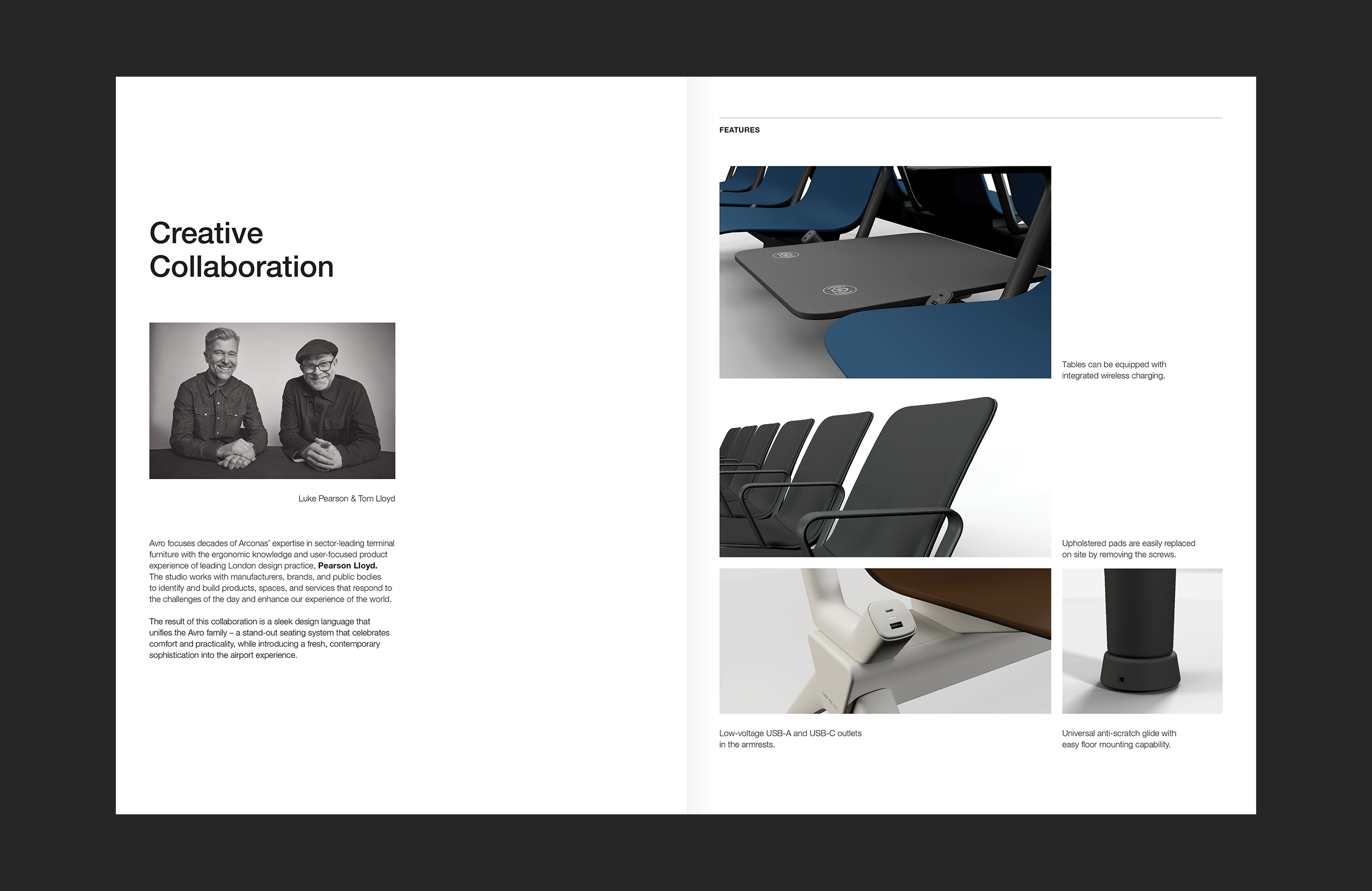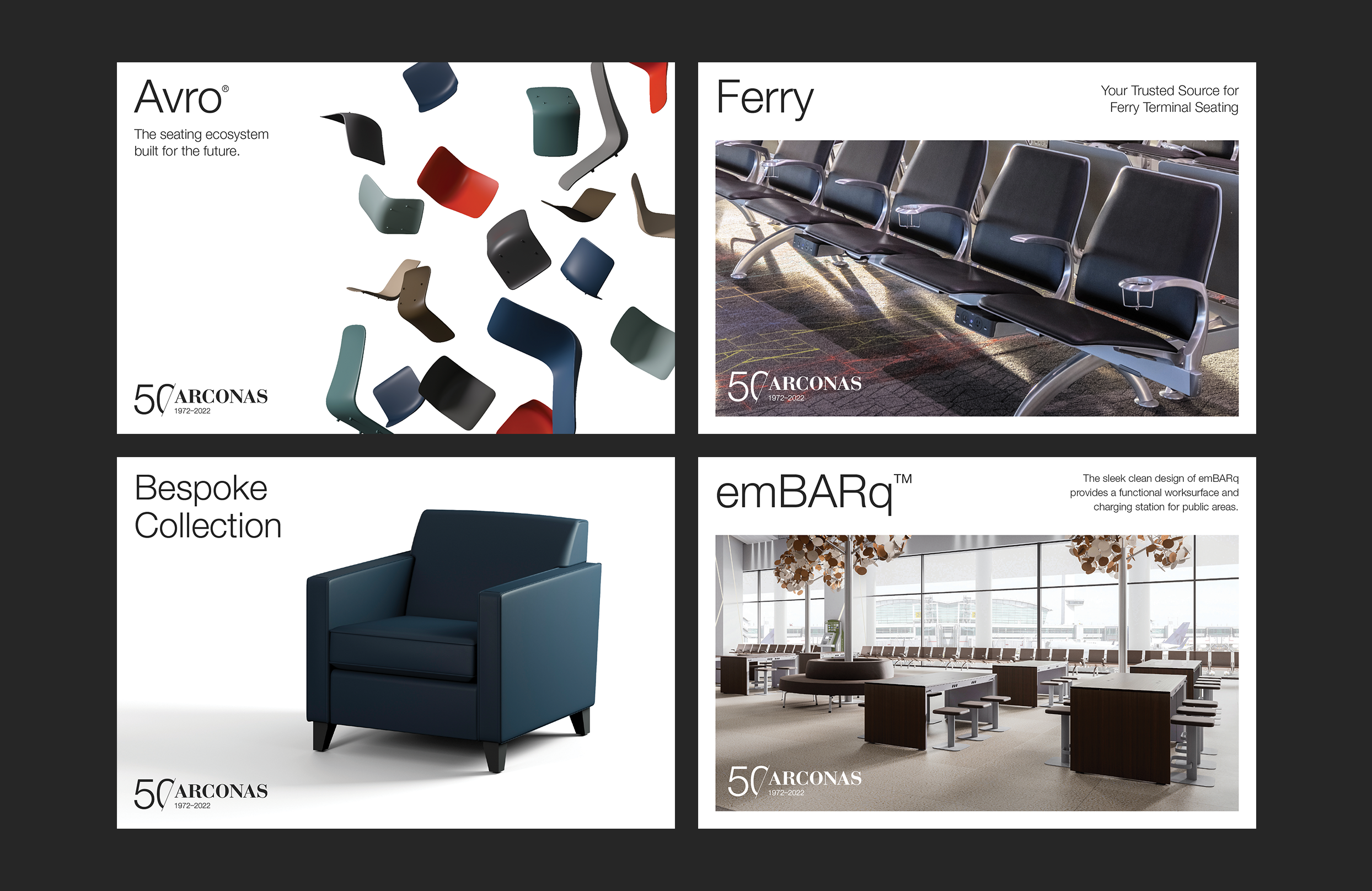 Arconas is a leading manufacturer and distributor of high-performance furniture for airports and transportation terminals. During my time at Field Trip and Co., Arconas required ongoing design support from social media production to their annual catalogue, Connections. I was responsible for leading multiple projects for Arconas, including the design of their 50th Anniversary logo, multiple furniture collection postcards and ads, and notably the production of a promotional brochure for their Avro line which has since been used as a template for additional catalogues.