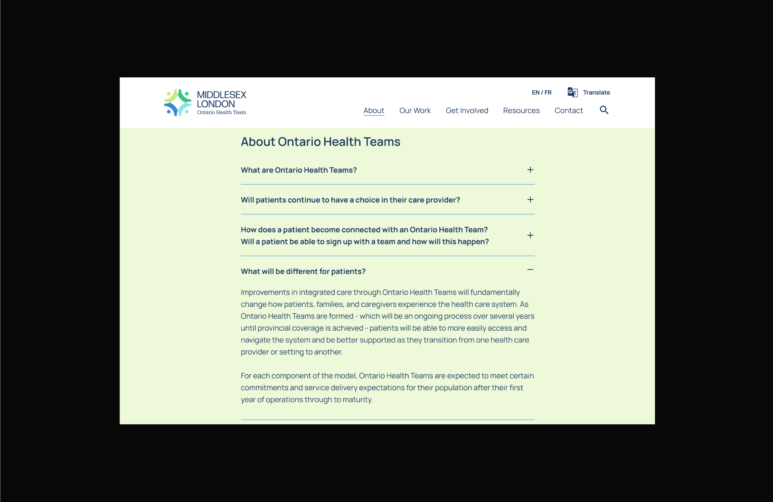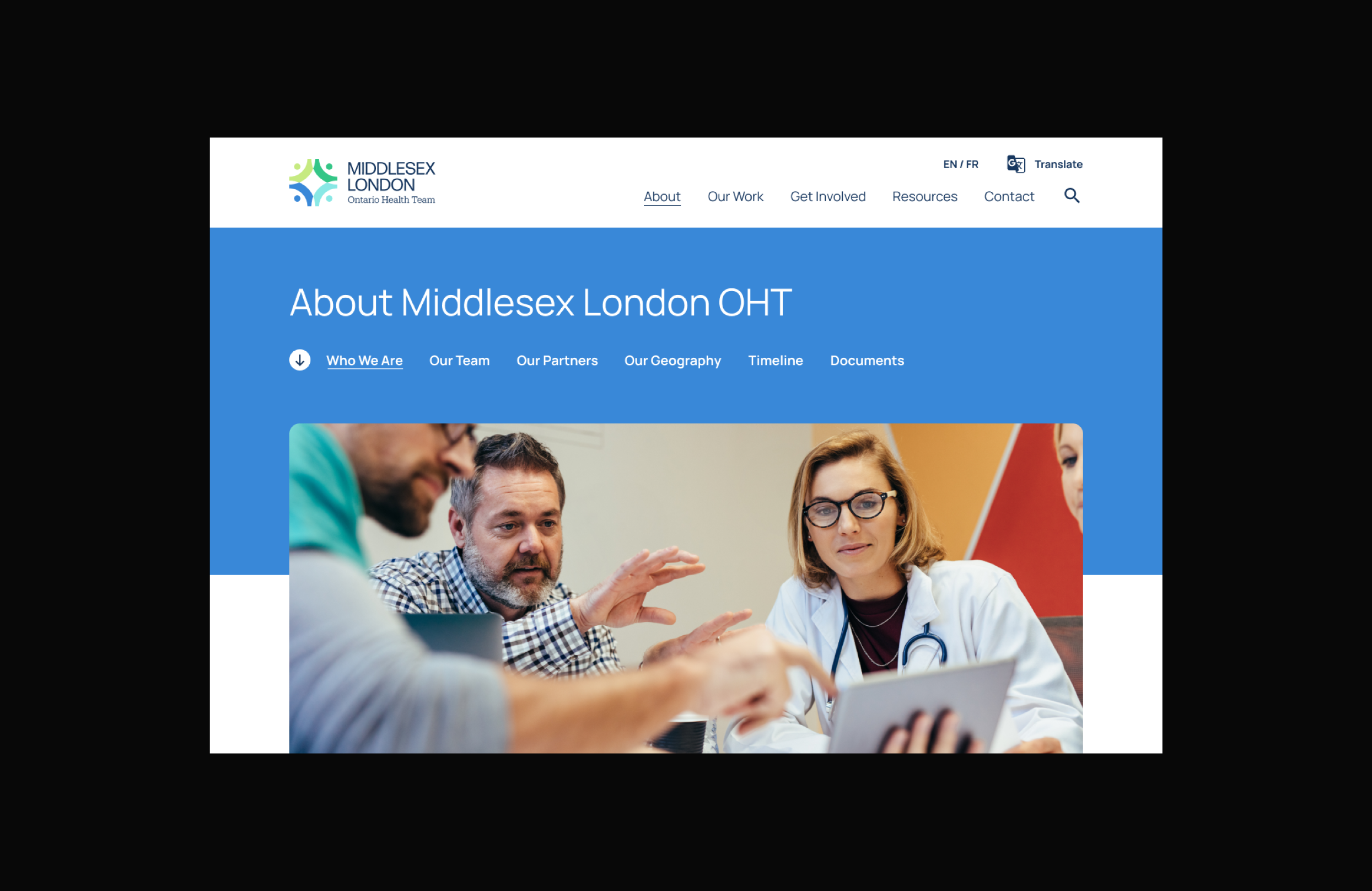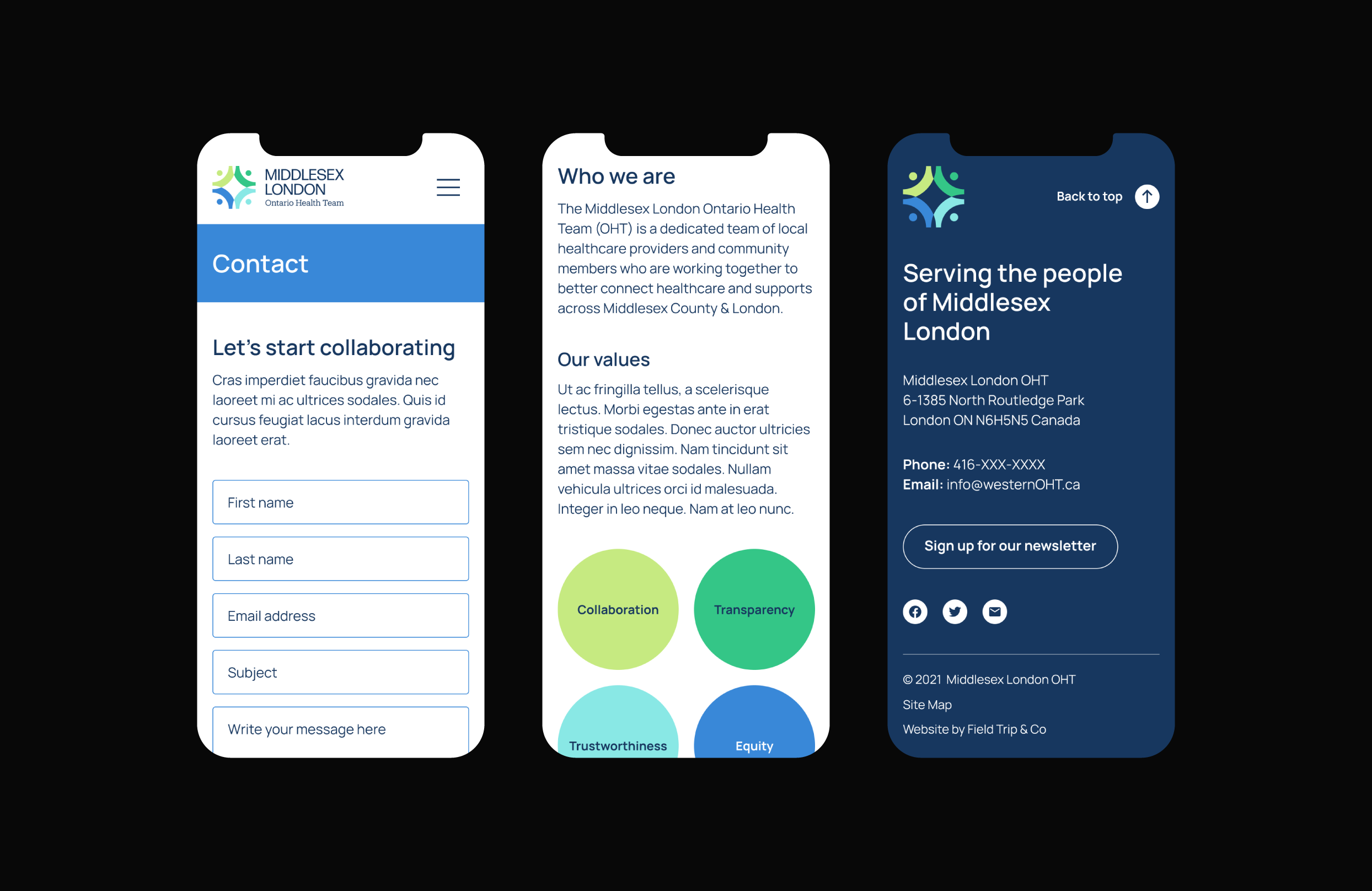 The Western Ontario Health Team needed a recognizable brand identity to connect with their communities. I assisted in facilitating both a naming and branding workshop with their task force and council to come up with a more suitable, focused name—Middlesex London Ontario Health Team (MLOHT). Working in tandem with Joyce Dang at Field Trip and Co., we collaborated on the branding for MLOHT that conveyed their core values of collaboration, equity, transparency, and trustworthiness, while clearly communicating the healthcare aspect of the organization. I then led the design of the MLOHT website as well as providing prototypes, development annotations, content authoring, and finally training on upkeep of the site.
